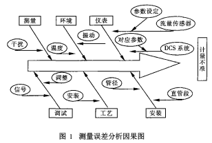 由于工藝的改造,問題相對錯綜復(fù)雜,從設(shè)計、安裝、運(yùn)行環(huán)境中都存在不同程度的改變,許多問題互相牽連,甚至一種問題是由不同的幾個原因共同造成的,再加上有些問題的解決需等待一定的工藝運(yùn)行時機(jī),故給問題的解決帶來了*大的困難?,F(xiàn)將影響測量誤差因素一一列舉(見圖1)。