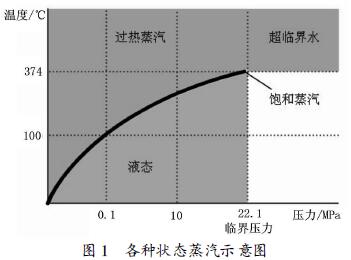 蒸汽是吸收潛熱后帶有一定壓力的水。蒸汽按狀態可分為飽和蒸汽和過熱蒸汽。由鍋爐產生的水蒸氣為飽和蒸汽,飽和蒸汽加熱得到過熱蒸汽。圖1說明了各種狀態蒸汽在不同溫度及壓力下的轉換關系。