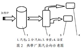 熱帶廠目前使用的蒸汽主要由加熱爐爐內管道汽化產生,蒸汽過渡儲存在汽包中。設計要求汽包工作壓力為0.50~0.80MPa,正常工作壓力為0.70MPa左右。汽包產生的蒸汽流量為3.0t/h。蒸汽通過DN100的管道輸送,蒸汽終端用戶為食堂和浴室,蒸汽主要用于加熱。圖2對熱帶廠的蒸汽去向作了簡單的說明。