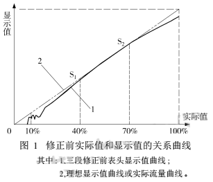 如上所述的基本策略實際上就是修正了40%以下的流量系數和修正了 70%以上的流量系數。用圖1表示就是改變了40%以下的流量指示值曲線的斜率和70%以上的流量指示值曲線的斜率。