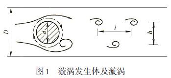 渦街流量計屬于速度式流量計,是由漩渦發生體和頻率檢測器構成的變送器、信號轉換器等環節組成。其測量原理是在流動的流體中,若垂直流動方向放置一個漩渦發生體,在某一雷諾數范圍內,將在漩渦發生體的后面的兩側交替產生有規律的漩渦(見圖1),旋渦列在旋渦發生體下游非對稱地排列。