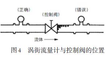 控制閥應安裝在渦街流量計的下游,這樣可解決液體流過控制閥時,因壓力下降而產生氣泡的不良影響,見圖4。渦街流量計安裝于水平管道時,當被測介質溫度大于200℃時,變送器一定要表頭向下安裝。