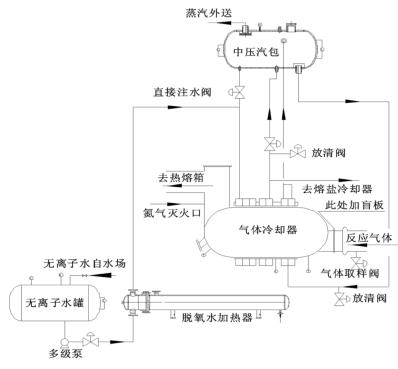 來自無離子水罐的脫氧水經多經泵加壓、經脫氧水加熱器加熱后進入到主蒸汽流量計的水段,脫氧水與反應氣體換熱后分兩路:一路進入中壓汽包,保證汽包有穩定的液位;一路進入熔鹽冷卻器帶出熔鹽攜帶的反應熱。來自中壓汽包的高溫水經管路接至主蒸汽流量計汽段底部,高溫水與反應氣體換熱后產生高壓蒸汽,高壓蒸汽又返回中壓汽包。汽包還有一路直接注水管路,此路水不經過主蒸汽流量計水段,而是直接進入汽包。在主蒸汽流量計出口溫度偏低而汽包液位也比較低時,可開此直接注水管路來穩定汽包液位。其詳細流程圖如圖 2。
