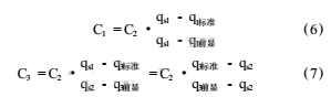 因?yàn)镃2S1就是S1點(diǎn)的實(shí)際流量(也是S1點(diǎn)的理想顯示值);C2S2就是S2點(diǎn)的實(shí)際流量(也是S2點(diǎn)的理想顯示值),所以,C2S1就是qs1(即40%的 qmax);C2S2就是qs2(即70%的qmax)。又因?yàn)閅1前、Y3前是全量程設(shè)置一個(gè)流量系數(shù)而得到了指示值;Y1后、Y3后是我們修正后的理想顯示值,所以,Y1后、Y3后就分別是標(biāo)準(zhǔn)流量值q1標(biāo)準(zhǔn)1、q3標(biāo)準(zhǔn)1;Y1前、Y3前就分別是未修正前表頭顯示值q1前顯、q3前顯。即:式(4)、(5)就變?yōu)?/div>