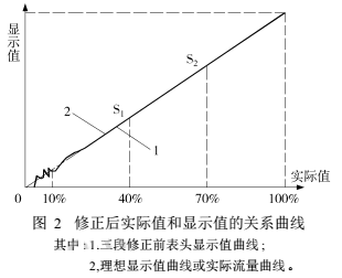 如上所述的基本策略實(shí)際上就是修正了40%以下的流量系數(shù)和修正了70%以上的流量系數(shù)。用圖1表示就是改變了40%以下的流量指示值曲線的斜率和70%以上的流量指示值曲線的斜率。
