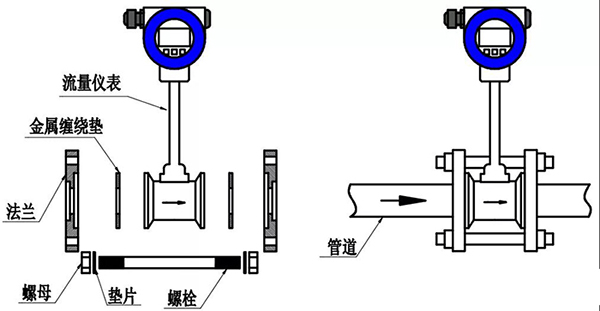 (3)在法蘭的內槽內裝上與管道通徑相同的密封墊圈,將流量計裝入法蘭中,流量計的流向標應與流體方向相同,然后用螺栓緊固好。