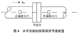 大口徑節流裝置的取壓方式,人們往往喜歡采用徑距取壓。這種取壓方式的兩個取壓口之間相距1.5D,而管徑又較大,所以取壓口之間的距離較大。在安裝過程中稍有疏忽,就會引入誤差。圖4所示為水平安裝的徑距取壓節流裝置,用來測量蒸汽流量。規范要求,正端和負端取壓管在母管上的開口高度應相同,兩個冷凝器的高度也應一致。如果施工疏忽造成即使10mm的高度差,用肉眼也難以分辨,但會引起實際流量為零時,仍有100Pa左右的輸出。