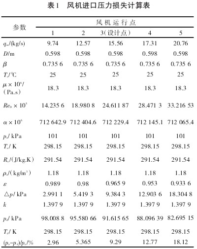 由于進氣壓力不大,流體可按理想氣體處理,即風機進氣溫度可認為不變,但進口孔板節流對風機進口壓力的影響不容忽略,因此,在風機設計時應予以高度注意。