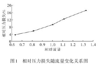 從表1中可以看出,設計點進口壓力相對損失近10%,*小點近3%,*大點近18%,隨流量的增加相對壓力損失變化如圖1所示。