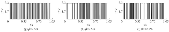 試驗發現,氣相的加入對氫氣流量計測量的影響顯著,譜分析和脈沖計數兩種方法隨著氣相注入的增加其表現也不同。圖4反映了水流量12m3/h時,注入不同氣含率β時A點的模擬信號,如圖4(a~c)所示;經譜分析后得到的頻率值,如圖4(d~f)所示;用脈沖計數方法得到的脈沖信號,如圖4(g~i)所示。圖4顯示,當注入氣量不大時,對氫氣流量計的影響不大,無論是譜分析結果還是脈沖計數得到的結果都比較好。當注入的氣量進一步增加時,渦街原始信號強度和穩定性逐漸變差,渦街頻率信號會被干擾信號所淹沒,反映到譜分析圖是,渦街頻率的譜能量減小,干擾信號的譜能量加強;對于脈沖信號,會因為一些旋渦信號減弱,形成脈沖缺失現象,而不能真實地反映渦街產生的頻率。