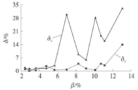 將試驗數據進行處理,得到了氫氣流量計測量誤差隨氣相含率變化的情況,如圖5所示。其中δs為譜分析方法的測量誤差,δc為脈沖計數方法的測量誤差。氫氣流量計的測量誤差用式(4)來計算。其中Qs為裝置中標準表測量出的管道總流量,Qt為試驗管段中氫氣流量計的測量值。將譜分析和脈沖計數得到的頻率值和儀表系數分別代入式(5)計算Qt值。從圖中可以看出氣相含率的增加兩種測量方法得到的誤差并不相同。當含氣率不高時,0<β<6%,譜分析法的平均誤差為1.226%,*大誤差為2.687%,脈沖計數法的平均誤差為1.583%,*大誤差為2.898%,因此譜分析法與脈沖計數法的測量誤差區別不大,譜分析沒有明顯的優勢;在氣相含率進一步增加時,6%<β<14%,譜分析法的平均誤差為3.975%,*大誤差為14.058%,脈沖計數法的平均誤差為20.053%,*大誤差為33.130%,脈沖計數的方法得到的測量誤差遠大于譜分析方法。