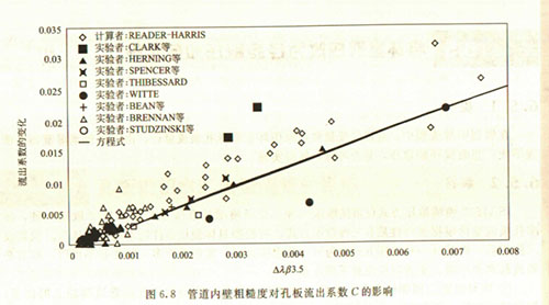 圖中所列的數(shù)據(jù)僅僅表明研究者對孔板做過這方面的研究,而不表明僅僅孔板有此影響。有的人吹噓說某種新型差壓裝置不像孔板那樣受雷諾數(shù)影響,不受管道內(nèi)壁粗糙度影響,那是不確切的。所有管壁取壓的差壓裝置都要受到雷諾數(shù)的影響和管壁粗糙度的影響。